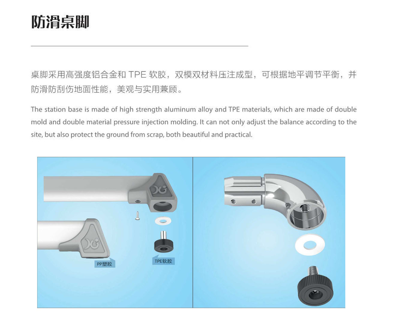 5.桌腳掌:1.5mm壁厚,腳套底有4個平衡調節(jié)機構。